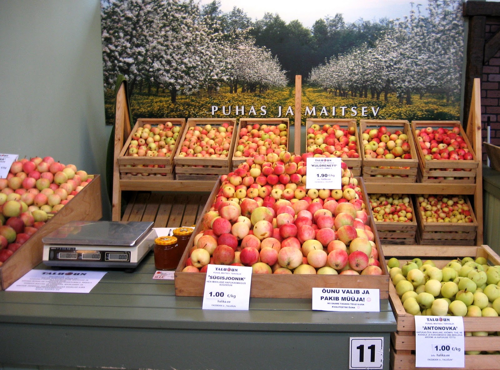 Oktoobris, seni kuni saab veel õues õunu müüa, on meil siin sees letil väiksemad ilusti sorteeritud õunad. Õueletilt pakume suuremaid ja kvaliteetsema välimusega õunu. |